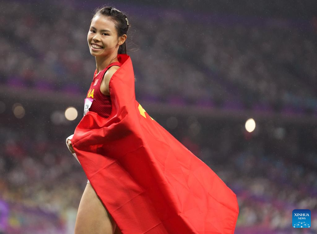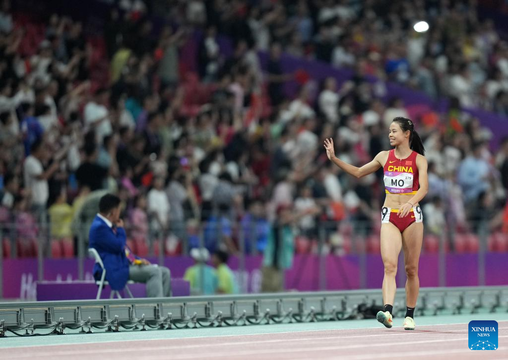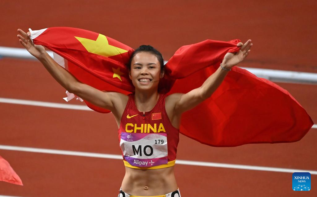 Mo Jiadie of China celebrates after the Women's 400m Hurdles Final of Athletics at the 19th Asian Games in Hangzhou, east China's Zhejiang Province, Oct. 3, 2023. (Xinhua/Sun Fei)