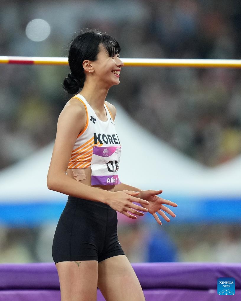 Oh Sujeong of South Korea reacts during the Women's High Jump Final of Athletics at the 19th Asian Games in Hangzhou, east China's Zhejiang Province, Oct. 3, 2023. (Xinhua/Sun Fei)