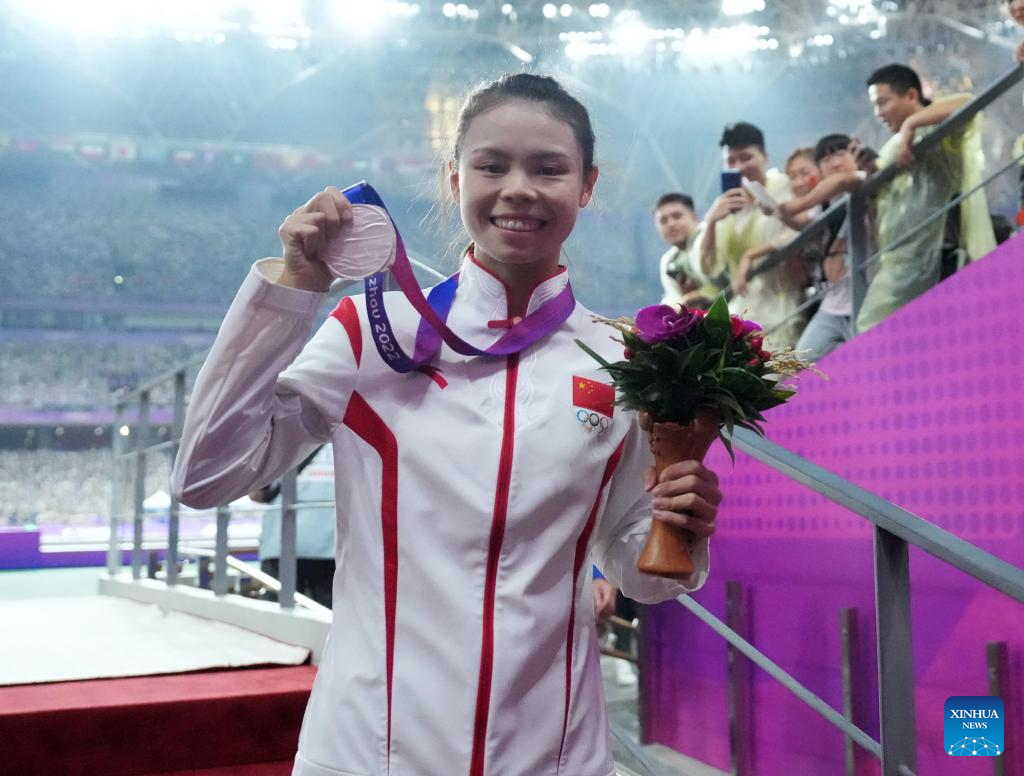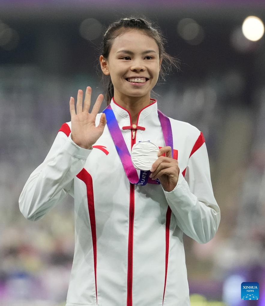 Silver medalist Mo Jiadie of China reacts during the victory ceremony for the Women's 400m Hurdles of Athletics at the 19th Asian Games in Hangzhou, east China's Zhejiang Province, Oct. 3, 2023. (Xinhua/Sun Fei)