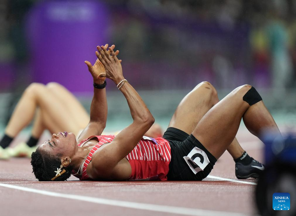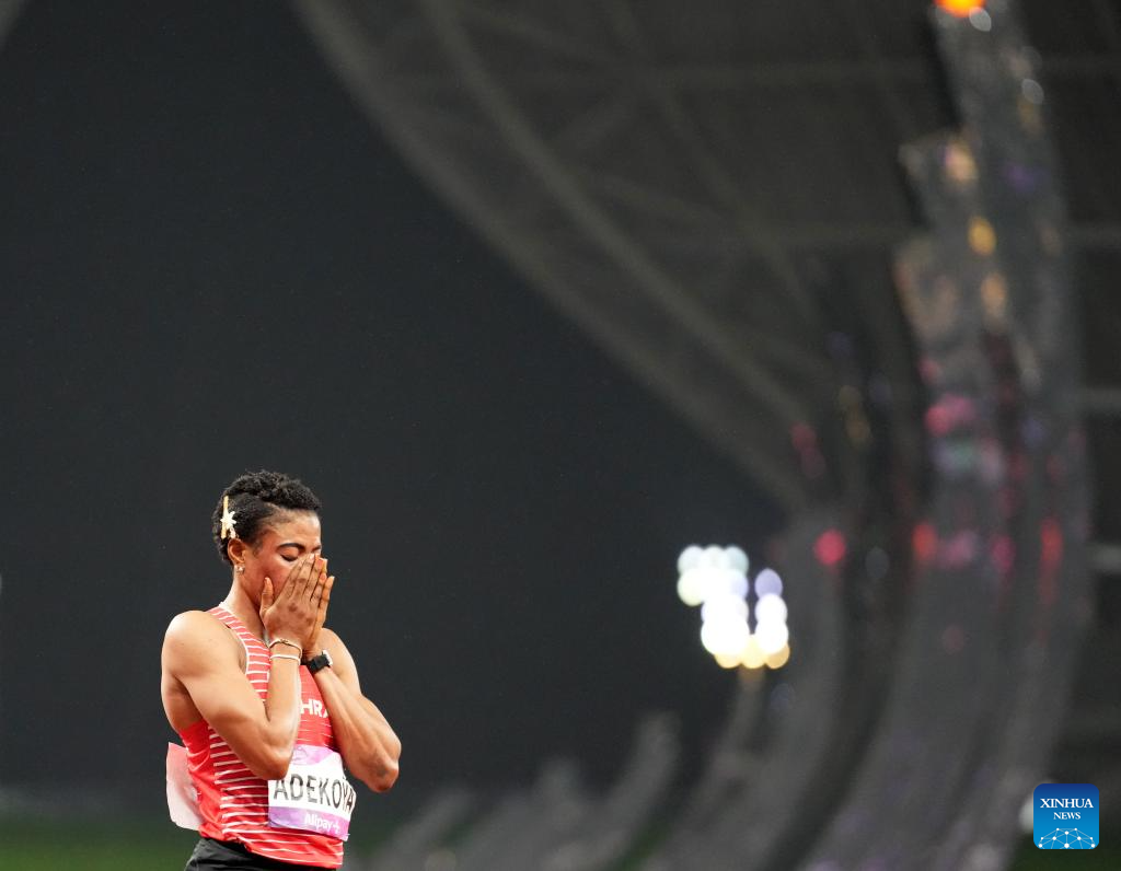 Oluwakemi Mujidat Adekoya of Bahrain reacts after the Women's 400m Hurdles Final of Athletics at the 19th Asian Games in Hangzhou, east China's Zhejiang Province, Oct. 3, 2023. (Xinhua/Sun Fei)