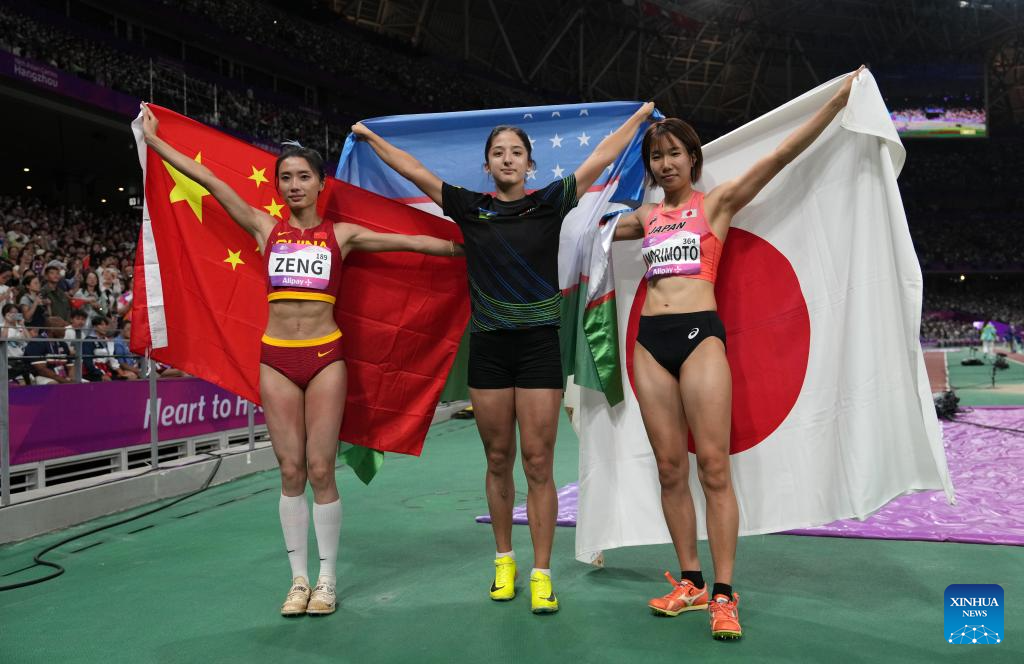 Sharifa Davronova(C) of Uzbekistan, Zeng Rui(L) of China and Morimoto Mariko of Japan celebrate after the Women's Triple Jump Final of Athletics at the 19th Asian Games in Hangzhou, east China's Zhejiang Province, Oct. 4, 2023. (Xinhua/Li Yibo)