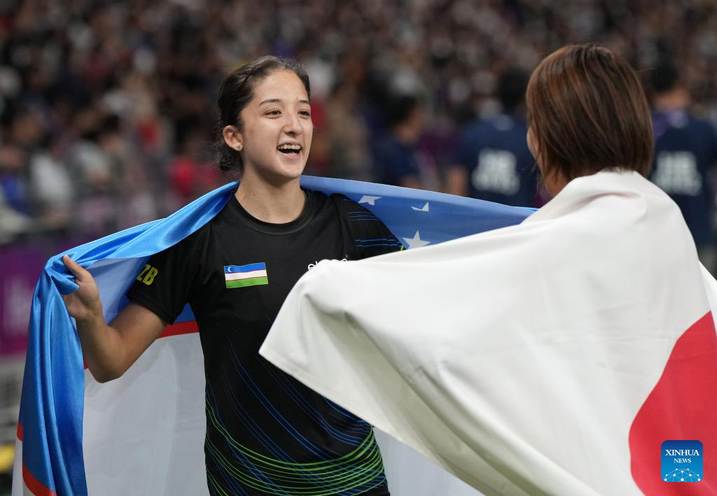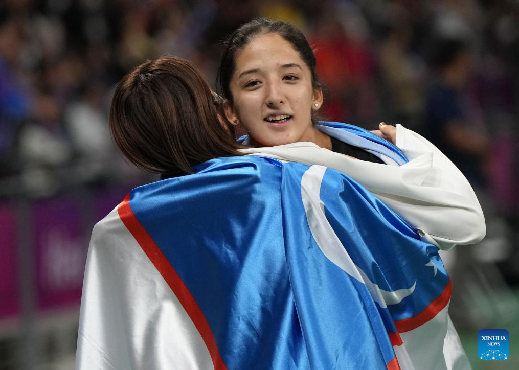 Sharifa Davronova(R) of Uzbekistan celebrates after the Women's Triple Jump Final of Athletics at the 19th Asian Games in Hangzhou, east China's Zhejiang Province, Oct. 4, 2023. (Xinhua/Li Yibo)