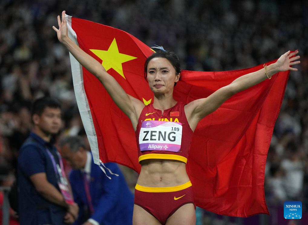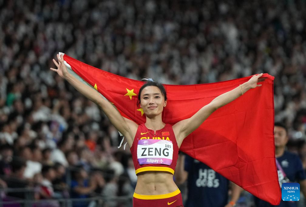 Zeng Rui of China celebrates after the Women's Triple Jump Final of Athletics at the 19th Asian Games in Hangzhou, east China's Zhejiang Province, Oct. 4, 2023. (Xinhua/Li Yibo)