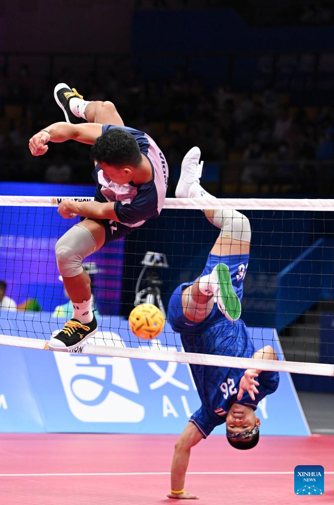 John Meitel Laishram (L) of India vies with Pichet Pansan of Thailand during the Men's Regu Preliminary of Sepaktakraw between Thailand and India at the 19th Asian Games in Jinhua, east China's Zhejiang Province, Oct. 5, 2023. (Xinhua/Chen Zhonghao)