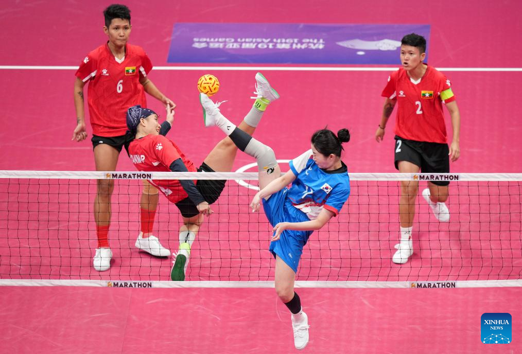 Jeon Gyumi (2nd R) of South Korea and Khin Hnin Wai (2nd L) of Myanmar compete during the Women's Regu Preliminary of Sepaktakraw between South Korea and Myanmar at the 19th Asian Games in Jinhua, east China's Zhejiang Province, Oct. 5, 2023. (Xinhua/Chen Zhonghao)