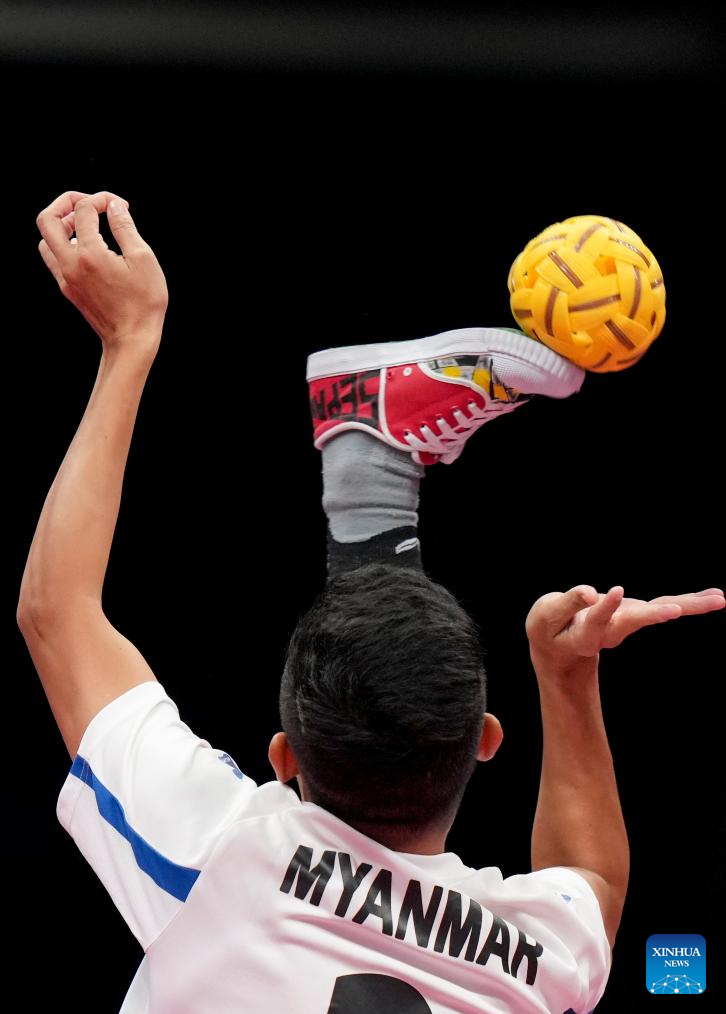 Thu Aung Khant of Myanmar competes during the Men's Regu Preliminary of Sepaktakraw between Myanmar and the Philippines at the 19th Asian Games in Jinhua, east China's Zhejiang Province, Oct. 5, 2023. (Xinhua/Chen Zhonghao)