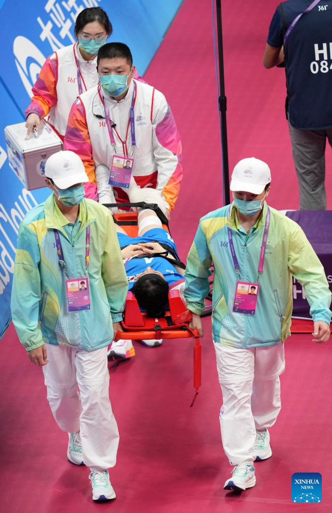 Park Seon Ju of South Korea gets injured during the Women's Regu Preliminary of Sepaktakraw between South Korea and Myanmar at the 19th Asian Games in Jinhua, east China's Zhejiang Province, Oct. 5, 2023. (Xinhua/Chen Zhonghao)