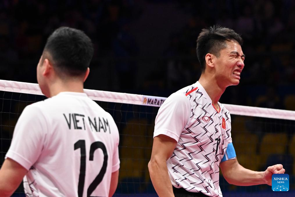 Dau Van Hoang (R) of Vietnam celebrates scoring during the Men's Regu Preliminary of Sepaktakraw between Malaysia and Vietnam at the 19th Asian Games in Jinhua, east China's Zhejiang Province, Oct. 5, 2023. (Xinhua/Chen Zhonghao)