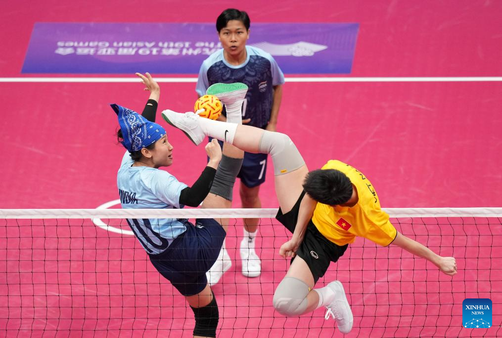 Priya Devi Elangbam (L) of India and Tran Thi Ngoc Yen (R) of Vietnam compete during the Women's Regu Preliminary of Sepaktakraw between Vietnam and India at the 19th Asian Games in Jinhua, east China's Zhejiang Province, Oct. 5, 2023. (Xinhua/Chen Zhonghao)