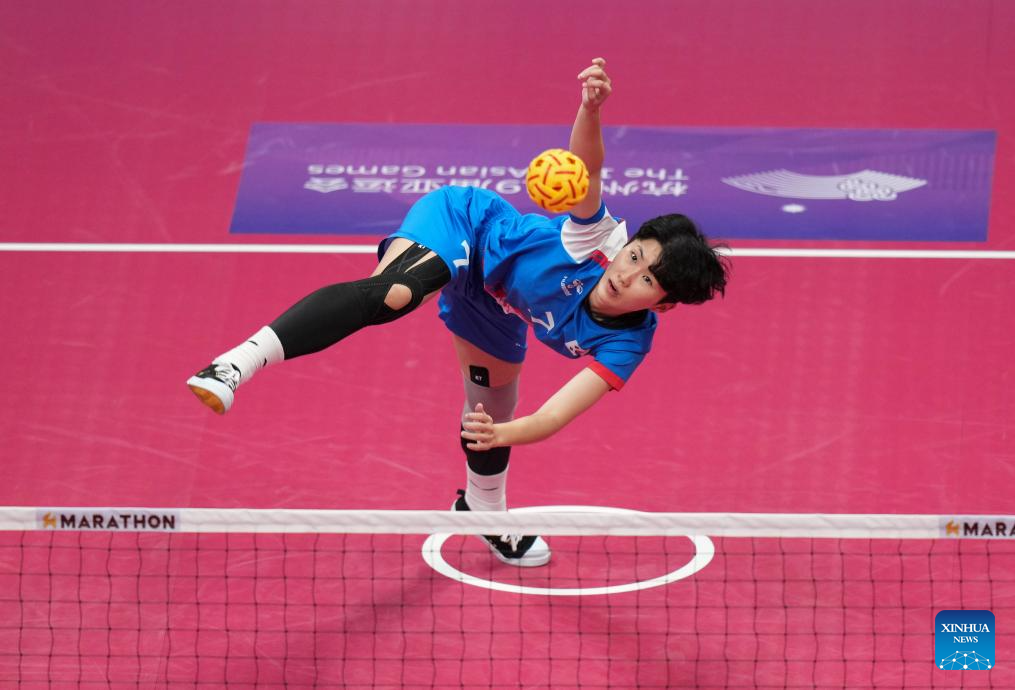 Tran Thi Ngoc Yen of Vietnam competes during the Women's Regu Preliminary of Sepaktakraw between Vietnam and India at the 19th Asian Games in Jinhua, east China's Zhejiang Province, Oct. 5, 2023. (Xinhua/Chen Zhonghao)