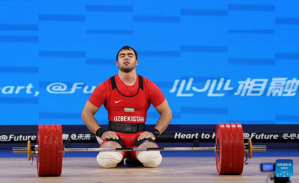 Akbar Djuraev of Uzbekistan reacts during Men's 109Kg Group A match of Weightlifting at the 19th Asian Games in Hangzhou, east China's Zhejiang Province, Oct. 6, 2023. (Xinhua/Yang Lei)