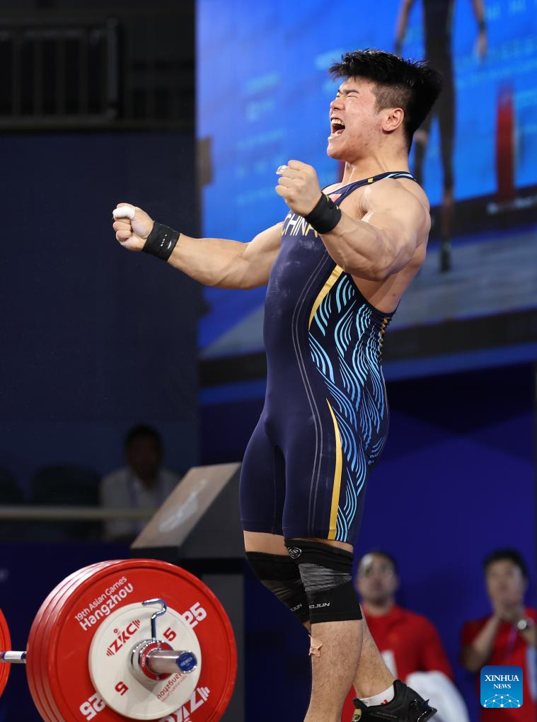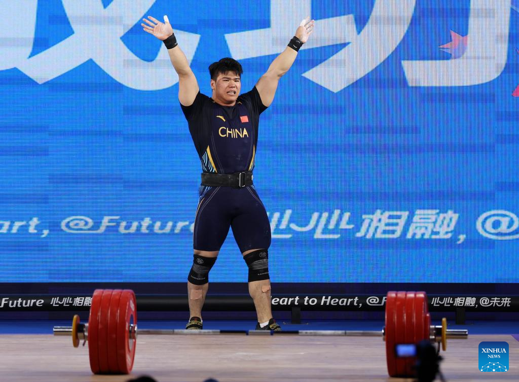 Liu Huanhua of China competes during Men's 109Kg Group A match of Weightlifting at the 19th Asian Games in Hangzhou, east China's Zhejiang Province, Oct. 6, 2023. (Xinhua/Yang Lei)