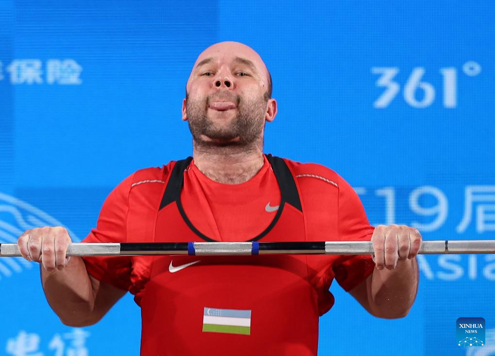 Ruslan Nurudinov of Uzbekistan competes during Men's 109Kg Group A match of Weightlifting at the 19th Asian Games in Hangzhou, east China's Zhejiang Province, Oct. 6, 2023. (Xinhua/Yang Lei)