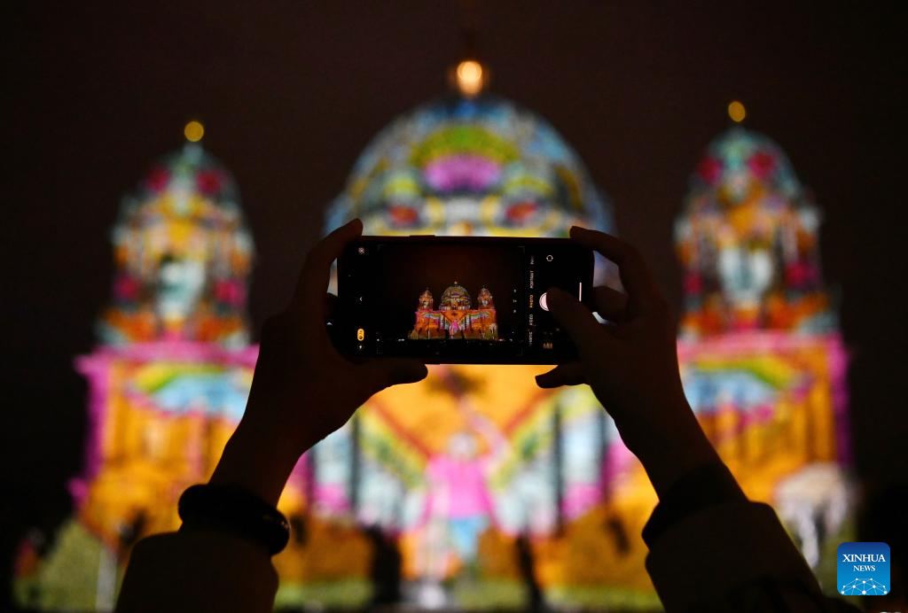 A visitor takes photos of the illuminated Berlin Cathedral during the 2023 Festival of Lights in Berlin, Germany, Oct. 6, 2023. Berlin on Friday turned into a city of light art with the opening of the 2023 Festival of Lights, which will last until Oct. 15. (Xinhua/Ren Pengfei)