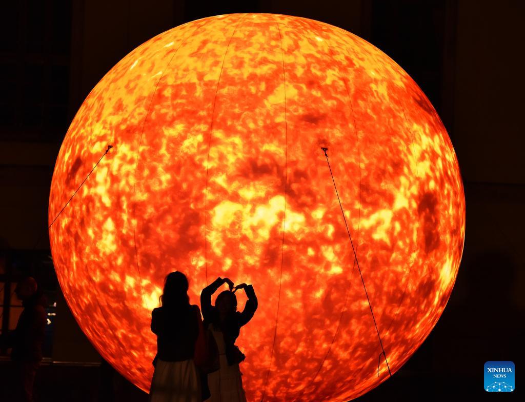 Visitors stand in front of an artwork at Humboldt University of Berlin during the 2023 Festival of Lights in Berlin, Germany, Oct. 6, 2023. Berlin on Friday turned into a city of light art with the opening of the 2023 Festival of Lights, which will last until Oct. 15. (Xinhua/Ren Pengfei)