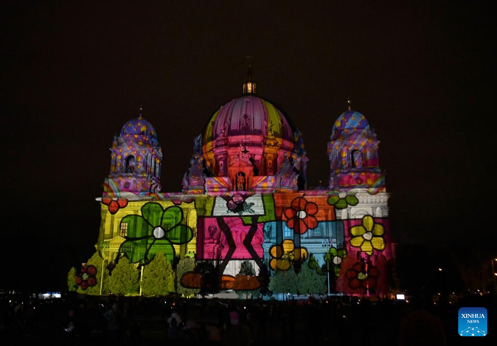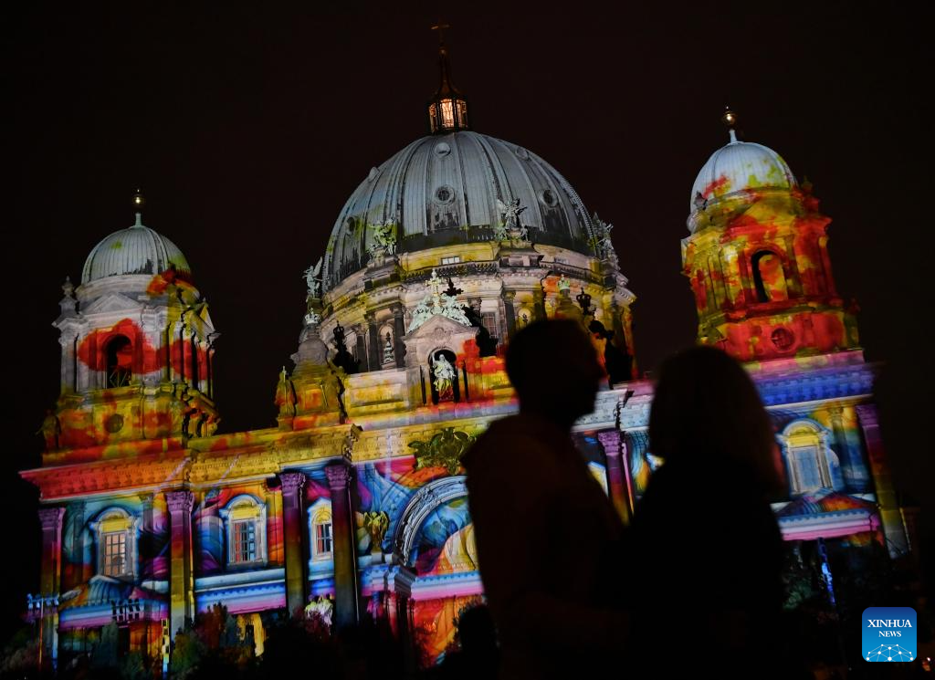 This photo taken on Oct. 6, 2023 shows the Berlin Cathedral illuminated during the 2023 Festival of Lights in Berlin, Germany. Berlin on Friday turned into a city of light art with the opening of the 2023 Festival of Lights, which will last until Oct. 15. (Xinhua/Ren Pengfei)