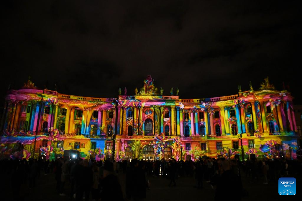 This photo taken on Oct. 6, 2023 shows the law faculty building of Humboldt University of Berlin illuminated during the 2023 Festival of Lights in Berlin, Germany. Berlin on Friday turned into a city of light art with the opening of the 2023 Festival of Lights, which will last until Oct. 15. (Xinhua/Ren Pengfei)
