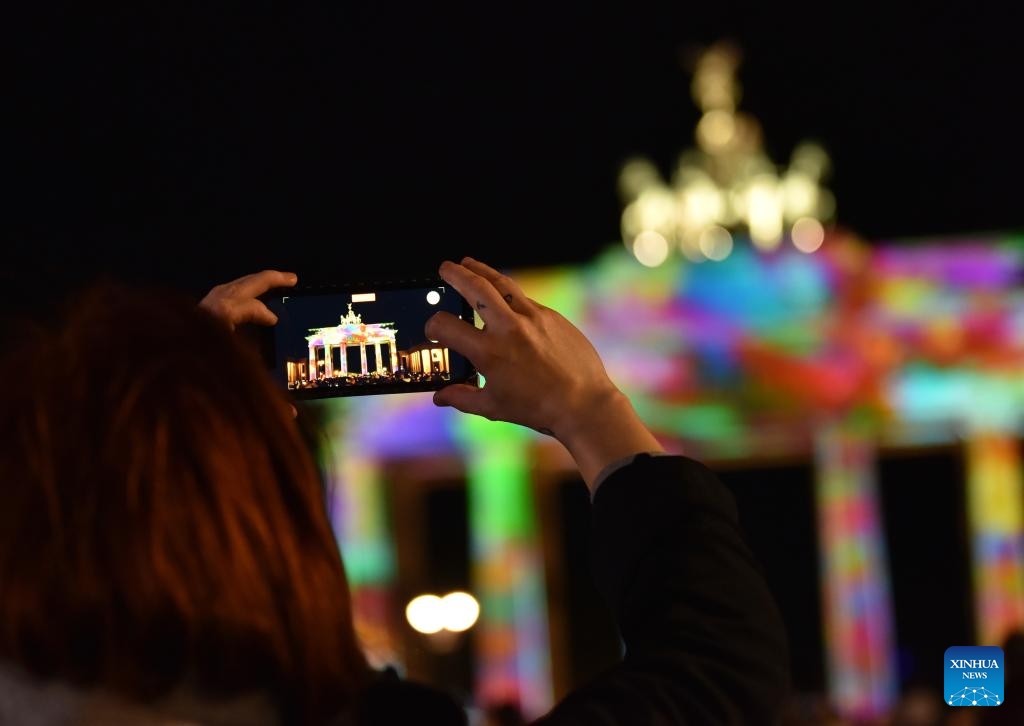 A visitor takes photos of the illuminated Brandenburg Gate during the 2023 Festival of Lights in Berlin, Germany, Oct. 6, 2023. Berlin on Friday turned into a city of light art with the opening of the 2023 Festival of Lights, which will last until Oct. 15. (Xinhua/Ren Pengfei)