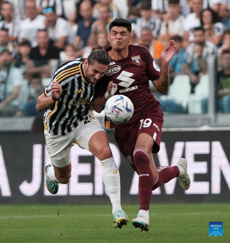 FC Juventus' Adrien Rabiot (L) vies with Torino's Raoul Bellanova during a Serie A soccer match between FC Juventus and Torino in Turin, Italy, Oct. 7, 2023. (Photo by Federico Tardito/Xinhua)