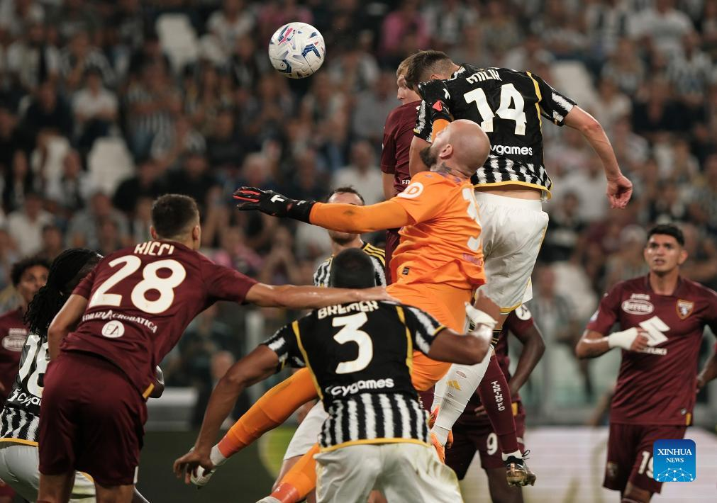 FC Juventus' Federico Gatti (2nd L) scores his goal during a Serie A soccer match between FC Juventus and Torino in Turin, Italy, Oct. 7, 2023. (Photo by Federico Tardito/Xinhua)