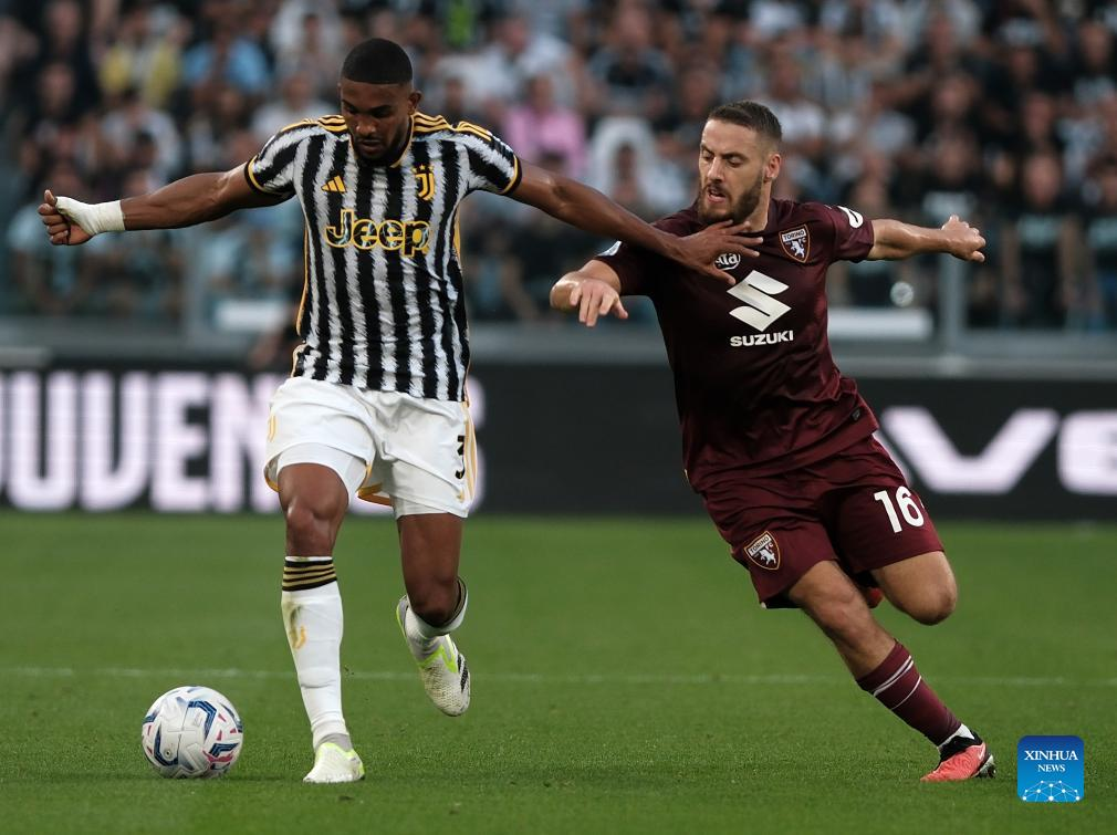 FC Juventus' Bremer (L) vies with Torino's Nikola Vlasic during a Serie A soccer match between FC Juventus and Torino in Turin, Italy, Oct. 7, 2023. (Photo by Federico Tardito/Xinhua)