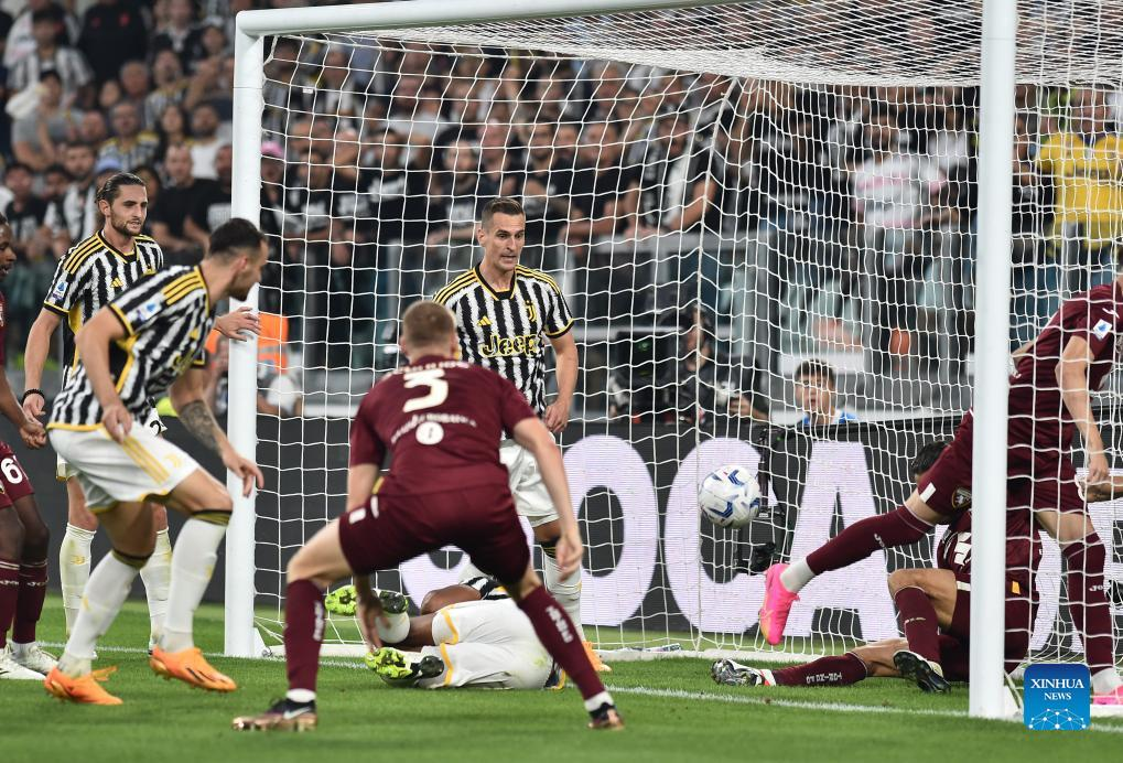FC Juventus' Arkadiusz Milik (2nd R) scores his goal during a Serie A soccer match between FC Juventus and Torino in Turin, Italy, Oct.7, 2023. (Photo by Federico Tardito/Xinhua)