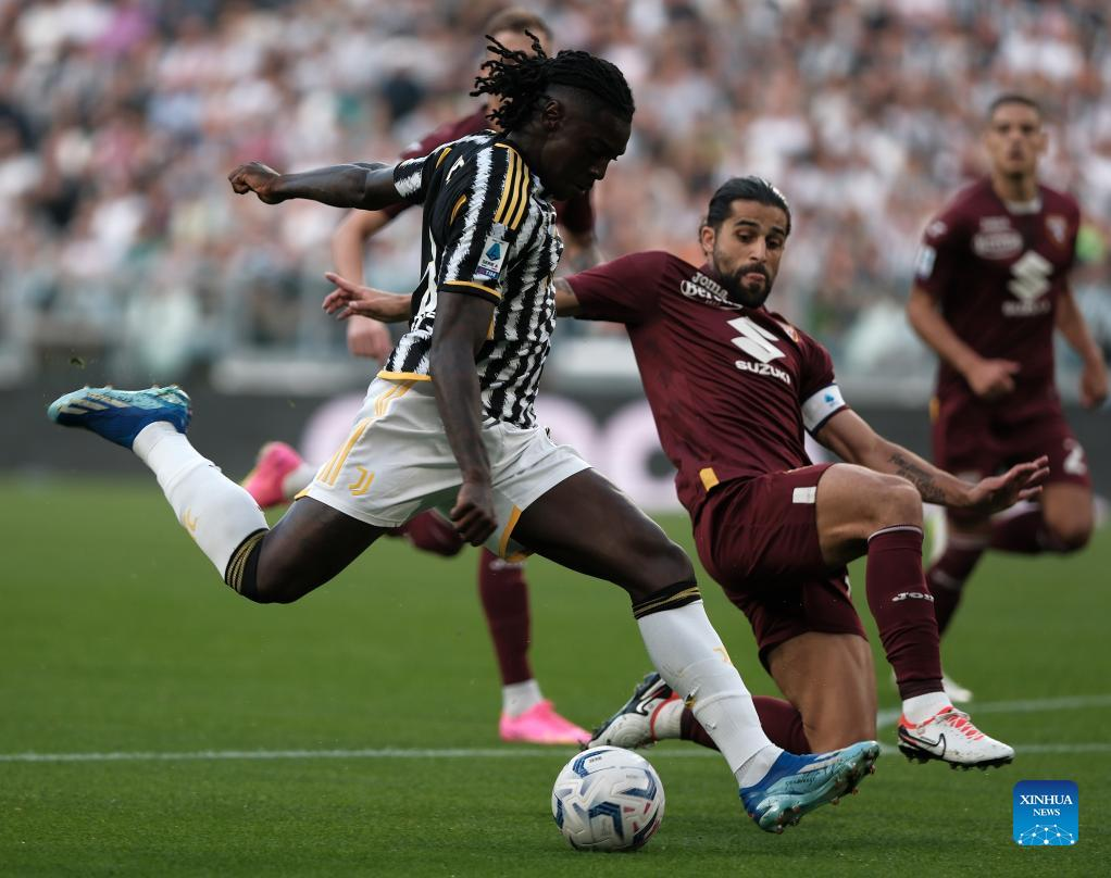 FC Juventus' Mouse Kean (L) vies with Torino's Ricardo Rodriguez during a Serie A soccer match between FC Juventus and Torino in Turin, Italy, Oct. 7, 2023. (Photo by Federico Tardito/Xinhua)