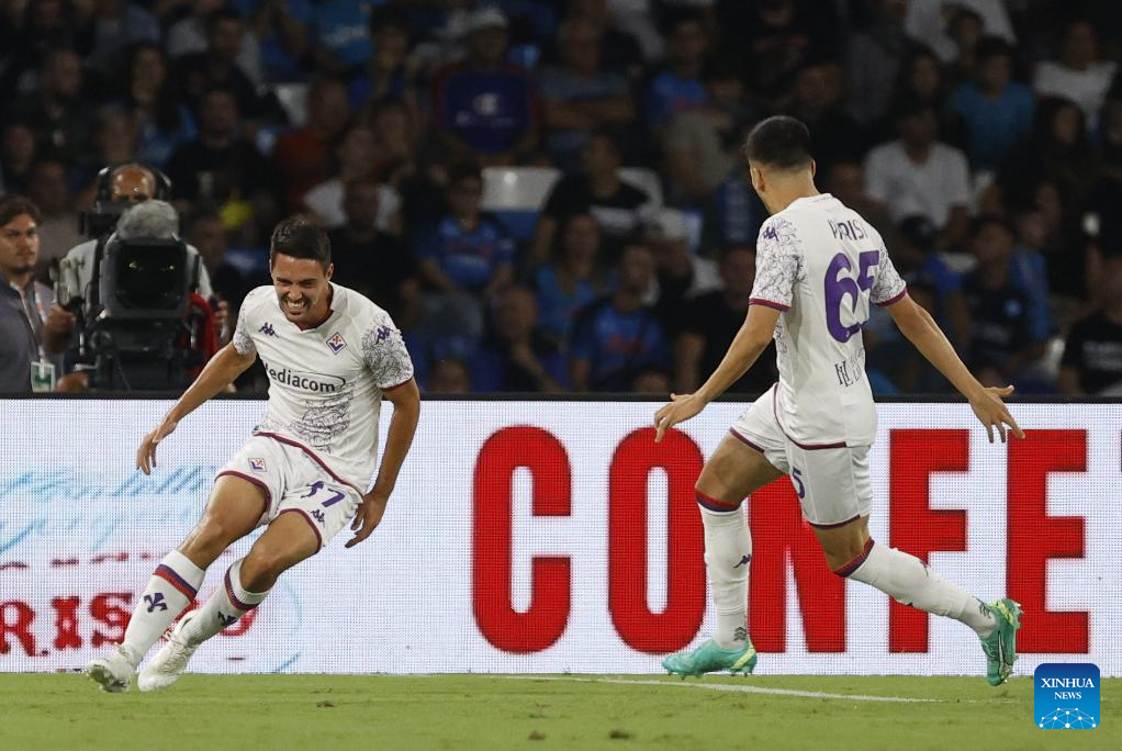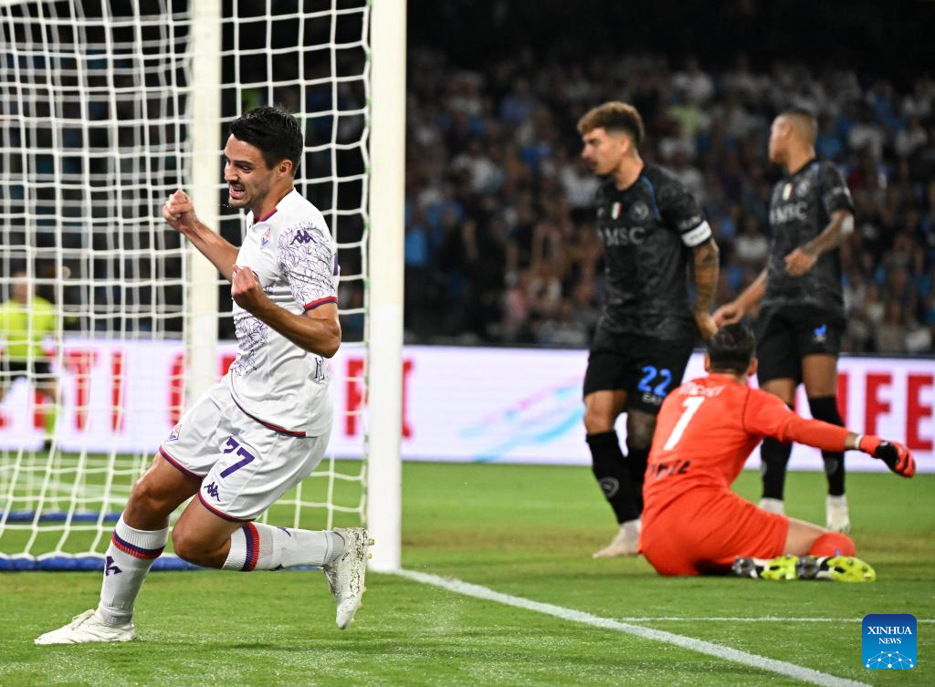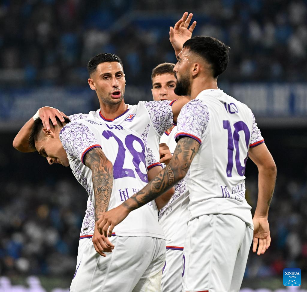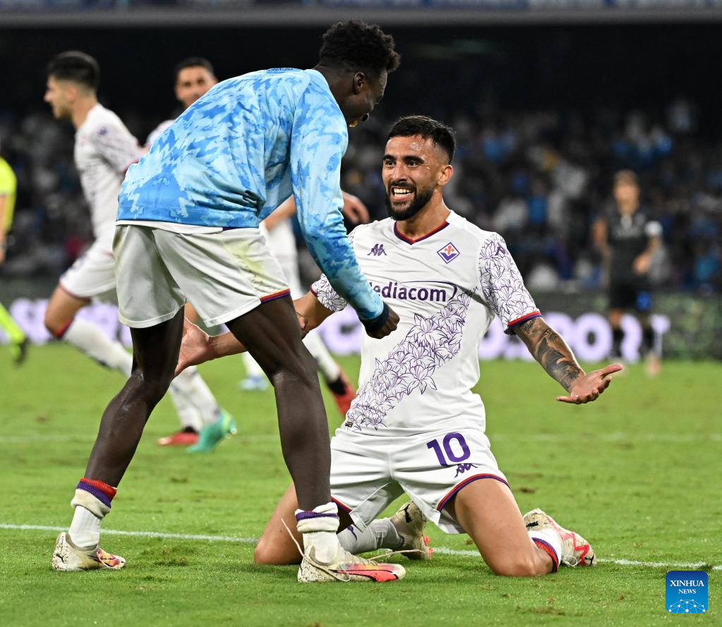 Fiorentina's Josip Brekalo (L) celebrates his goal during a Serie A soccer match between Napoli and Fiorentina in Naples, Italy, Oct. 8, 2023. (Photo by Alberto Lingria/Xinhua)