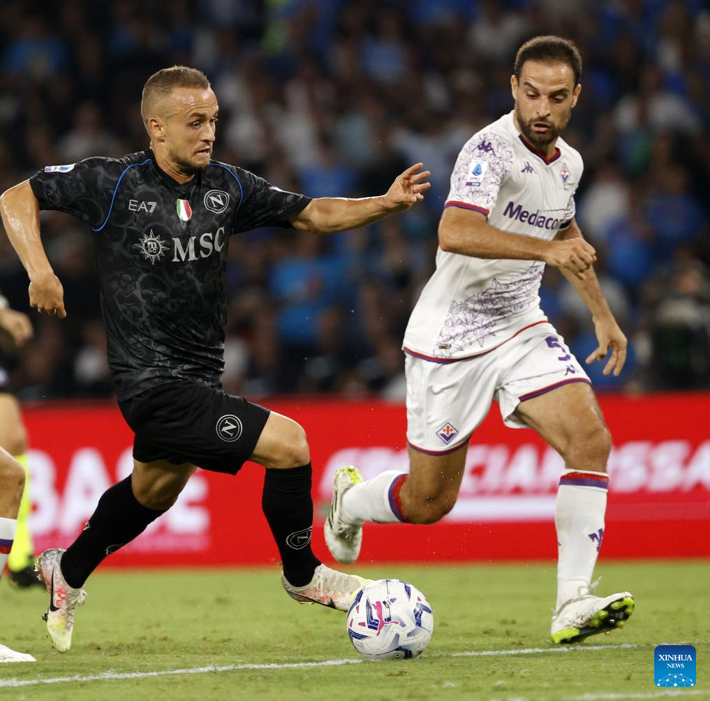 Napoli's Stanislav Lobotka (L) vies Fiorentina's Giacomo Bonaventura during a Serie A soccer match between Napoli and Fiorentina in Naples, Italy, Oct. 8, 2023. (Photo by Alberto Lingria/Xinhua)