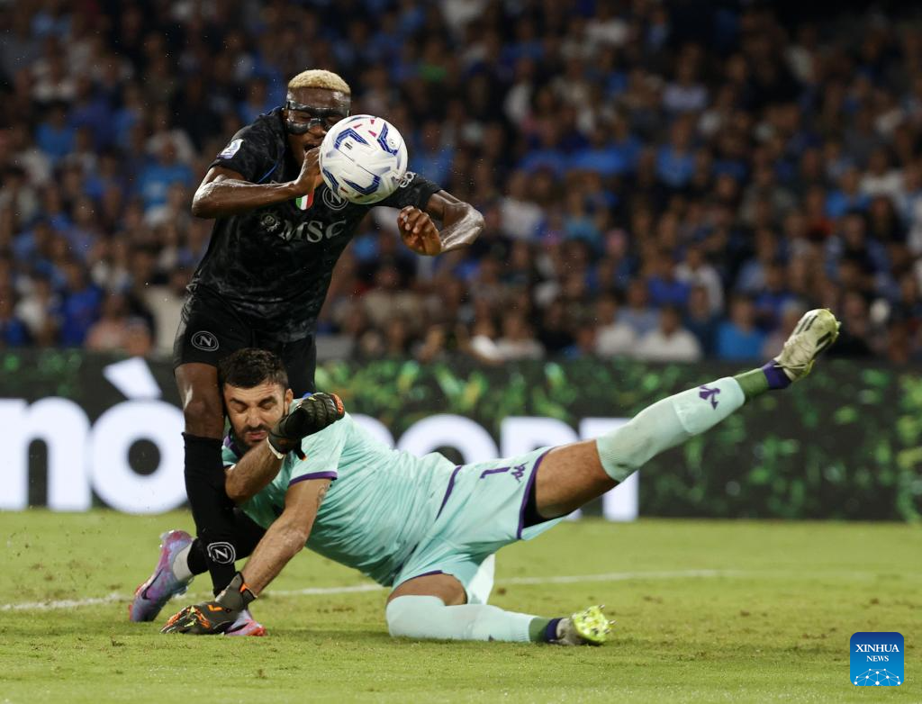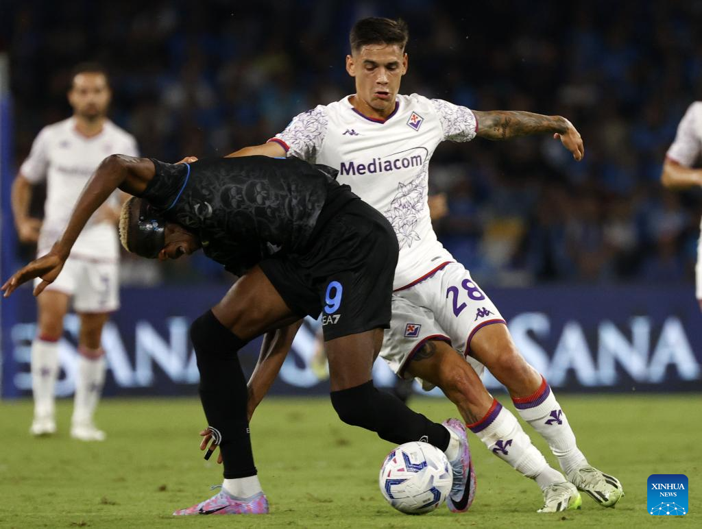 Napoli's Victor Osimhen (L) vies with Fiorentina's Pietro Terraciano during a Serie A soccer match between Napoli and Fiorentina in Naples, Italy, Oct. 8, 2023. (Photo by Alberto Lingria/Xinhua)