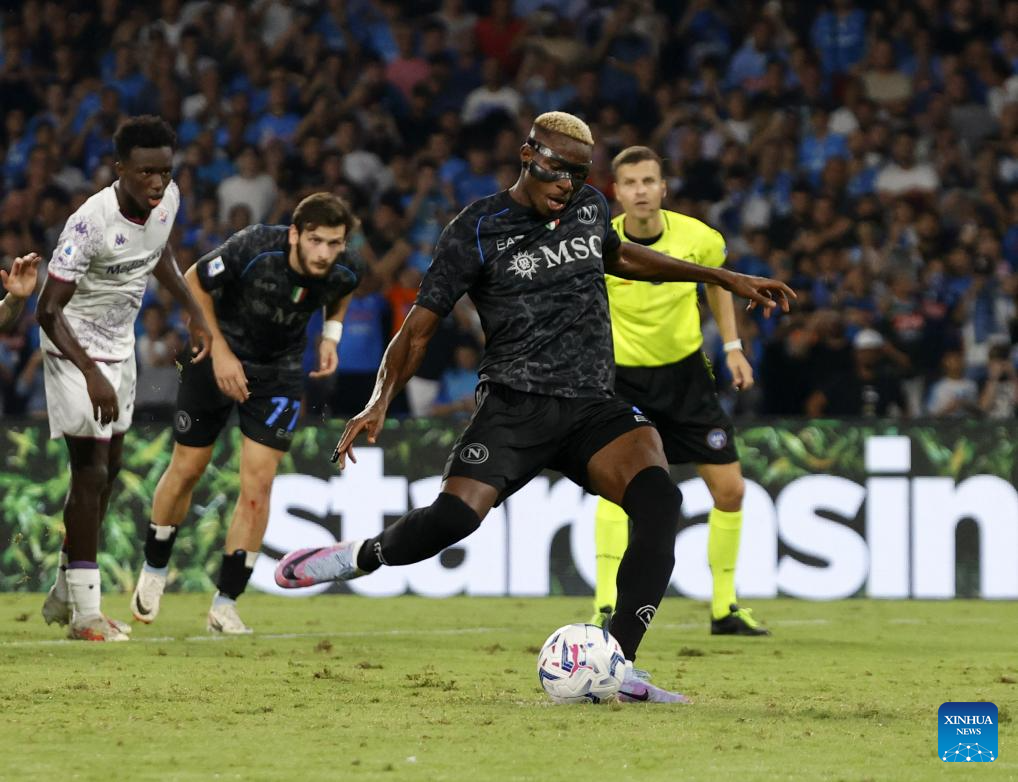 Napoli's Victor Osimhen scores his goal during a Serie A soccer match between Napoli and Fiorentina in Naples, Italy, Oct. 8, 2023. (Photo by Alberto Lingria/Xinhua)