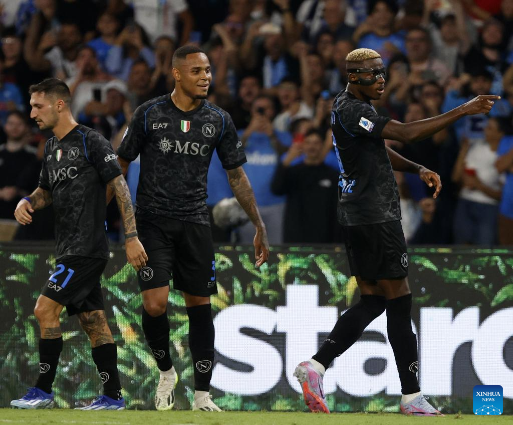 Napoli's Victor Osimhen (R) celebrates his goal during a Serie A soccer match between Napoli and Fiorentina in Naples, Italy, Oct. 8, 2023. (Photo by Alberto Lingria/Xinhua)