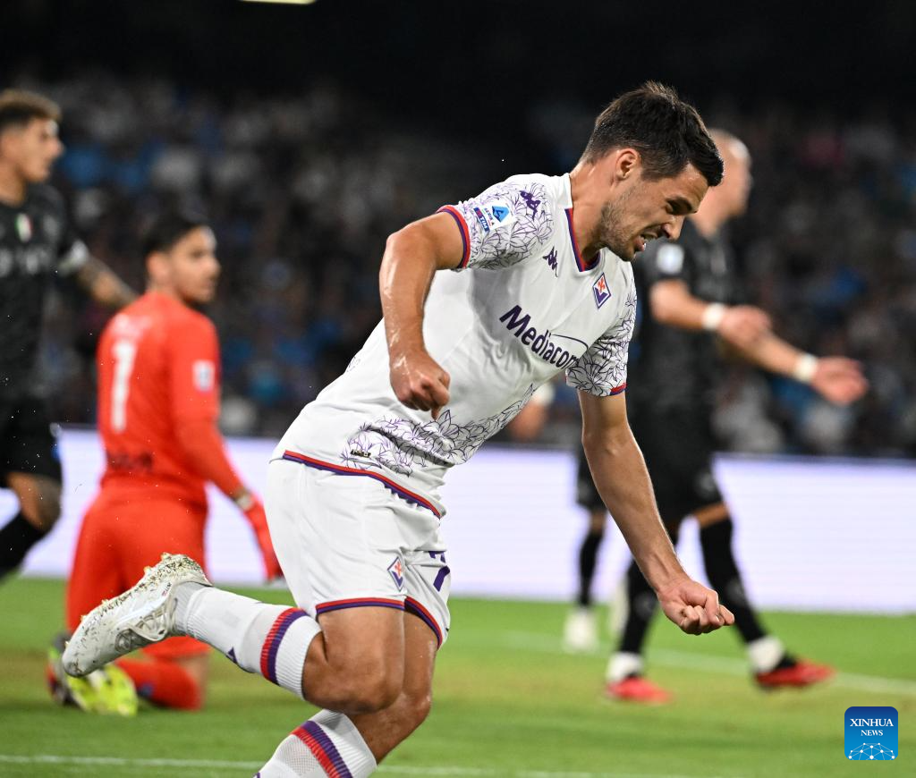 Fiorentina's Josip Brekalo celebrates his goal during a Serie A soccer match between Napoli and Fiorentina in Naples, Italy, Oct. 8, 2023. (Photo by Alberto Lingria/Xinhua)