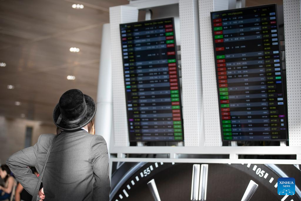 A passenger checks flight information at Ben Gurion International Airport near Tel Aviv, Israel, Oct. 12, 2023. International flights were delayed or cancelled due to the ongoing Israeli-Palestinian conflict erupted last weekend. (Xinhua/Chen Junqing)