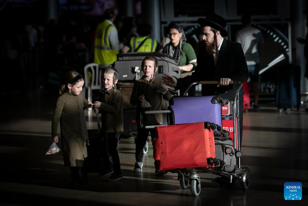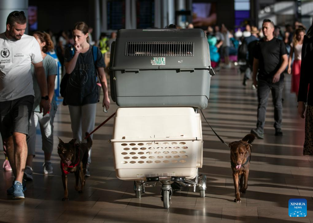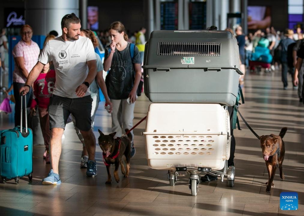 Passengers prepare to board a flight with their pets at Ben Gurion International Airport near Tel Aviv, Israel, Oct. 12, 2023. International flights were delayed or cancelled due to the ongoing Israeli-Palestinian conflict erupted last weekend. (Xinhua/Chen Junqing)