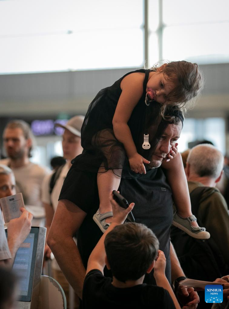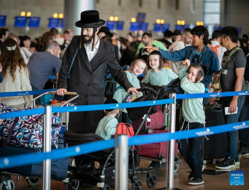 Passengers wait to check in at Ben Gurion International Airport near Tel Aviv, Israel, Oct. 12, 2023. International flights were delayed or cancelled due to the ongoing Israeli-Palestinian conflict erupted last weekend. (Xinhua/Chen Junqing)