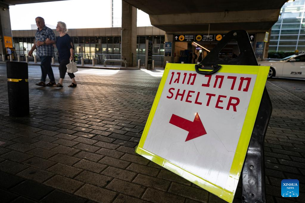 This photo taken on Oct. 12, 2023 shows a sign of shelter zone at Ben Gurion International Airport near Tel Aviv, Israel. International flights were delayed or cancelled due to the ongoing Israeli-Palestinian conflict erupted last weekend. (Xinhua/Chen Junqing)
