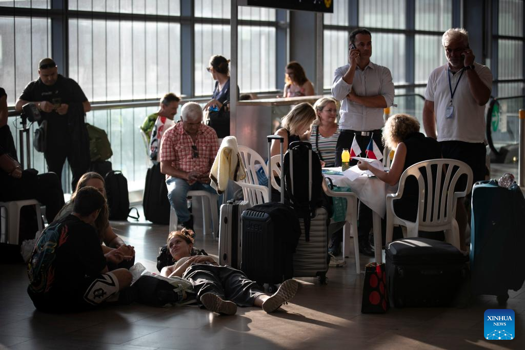 Stranded passengers wait at Ben Gurion International Airport near Tel Aviv, Israel, Oct. 12, 2023. International flights were delayed or cancelled due to the ongoing Israeli-Palestinian conflict erupted last weekend. (Xinhua/Chen Junqing)
