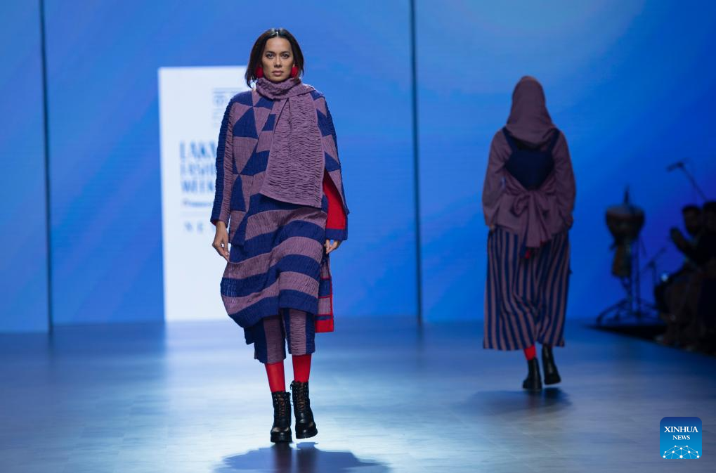 A model presents a creation by Indian designer Karishma Shahani during Lakme Fashion Week x FDCI in New Delhi, India, on Oct. 12, 2023. (Xinhua/Javed Dar)