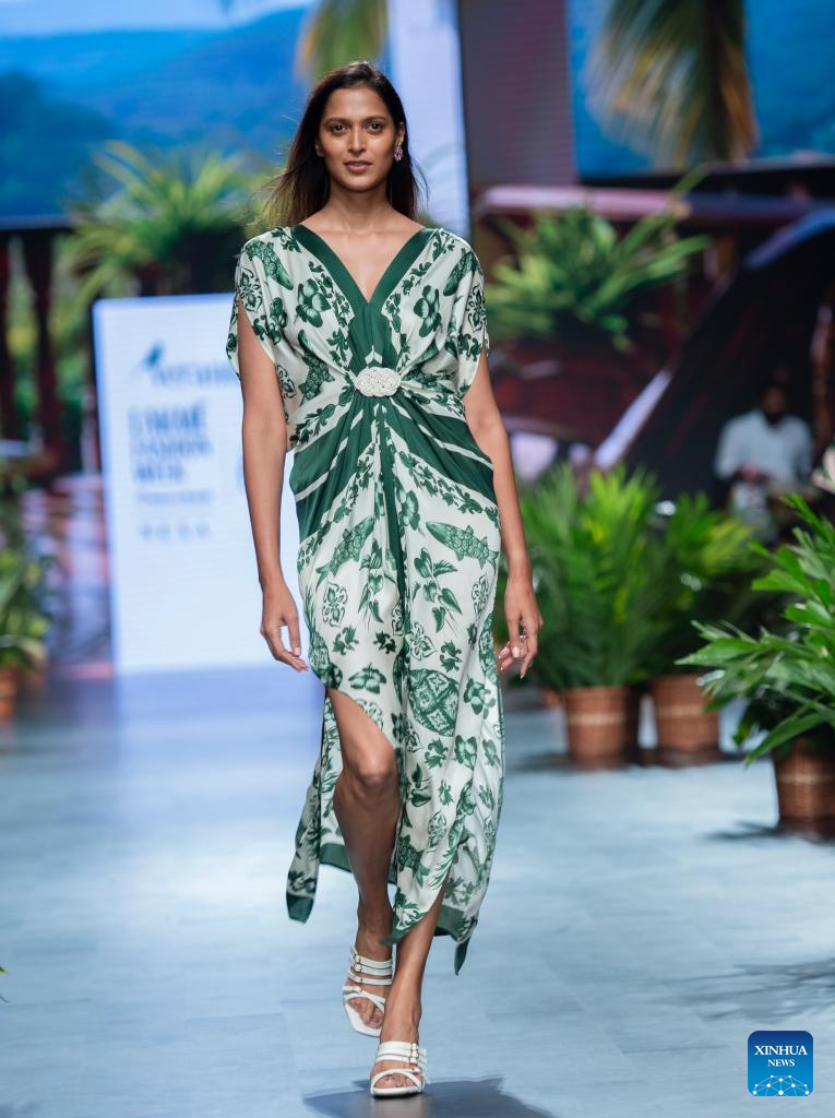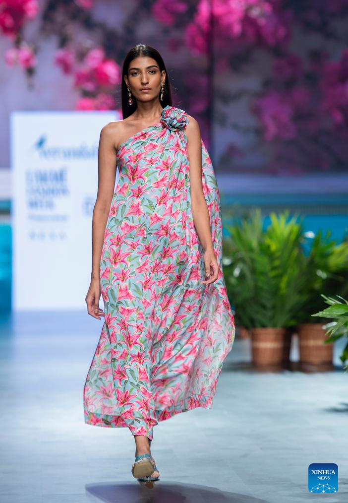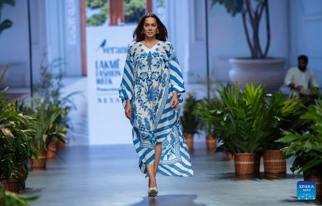 A model presents a creation by Indian designer Anjali Patel Mehta during Lakme Fashion Week x FDCI in New Delhi, India, on Oct. 12, 2023. (Xinhua/Javed Dar)