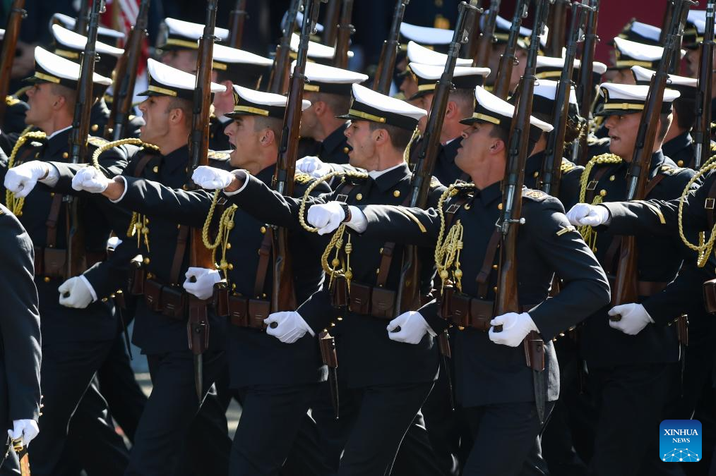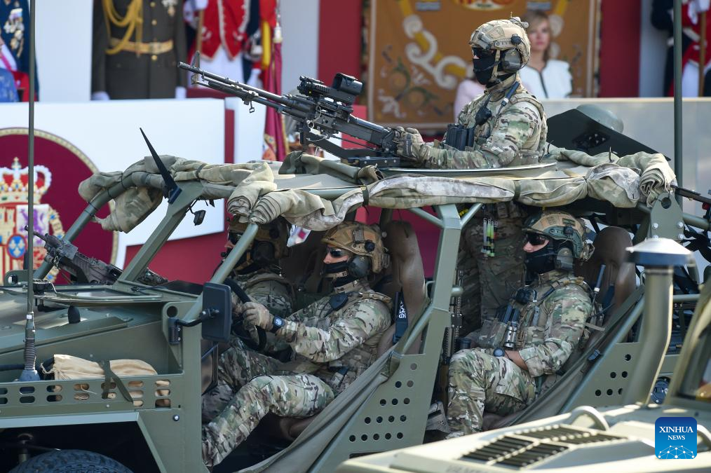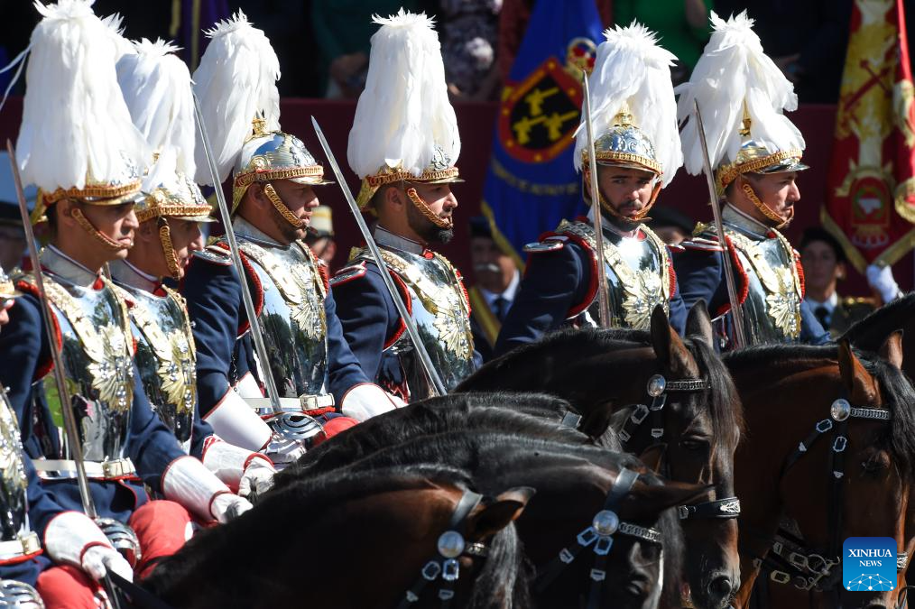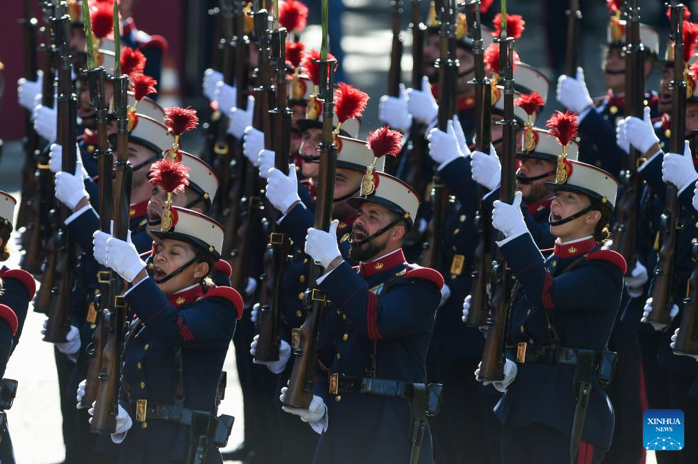 Soldiers parade during the National Day celebration in Madrid, Spain, Oct. 12, 2023. (Photo by Gustavo Valiente/Xinhua)