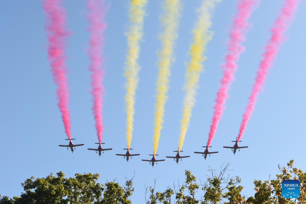 Aircrafts perform during the National Day celebration in Madrid, Spain, Oct. 12, 2023. (Photo by Gustavo Valiente/Xinhua)