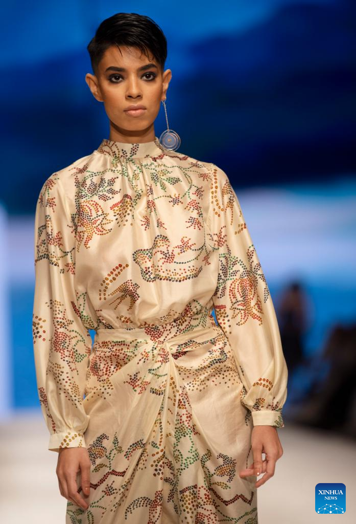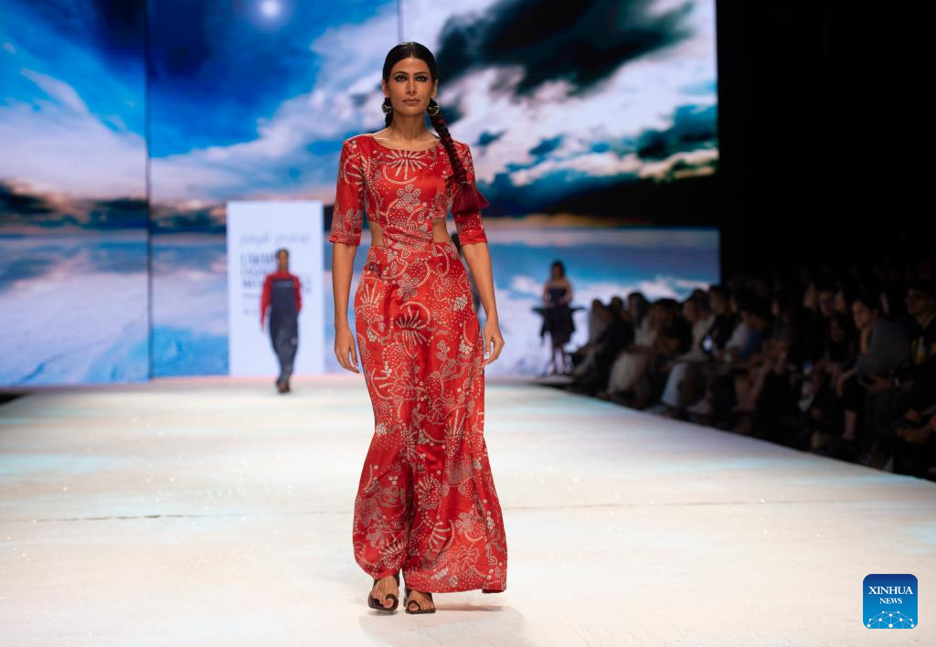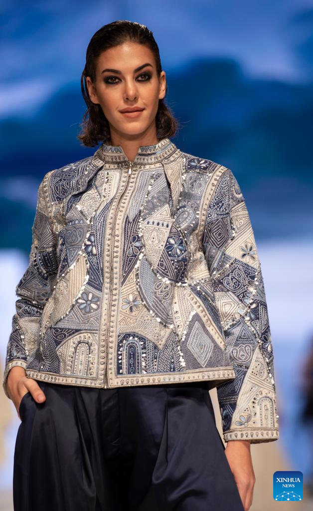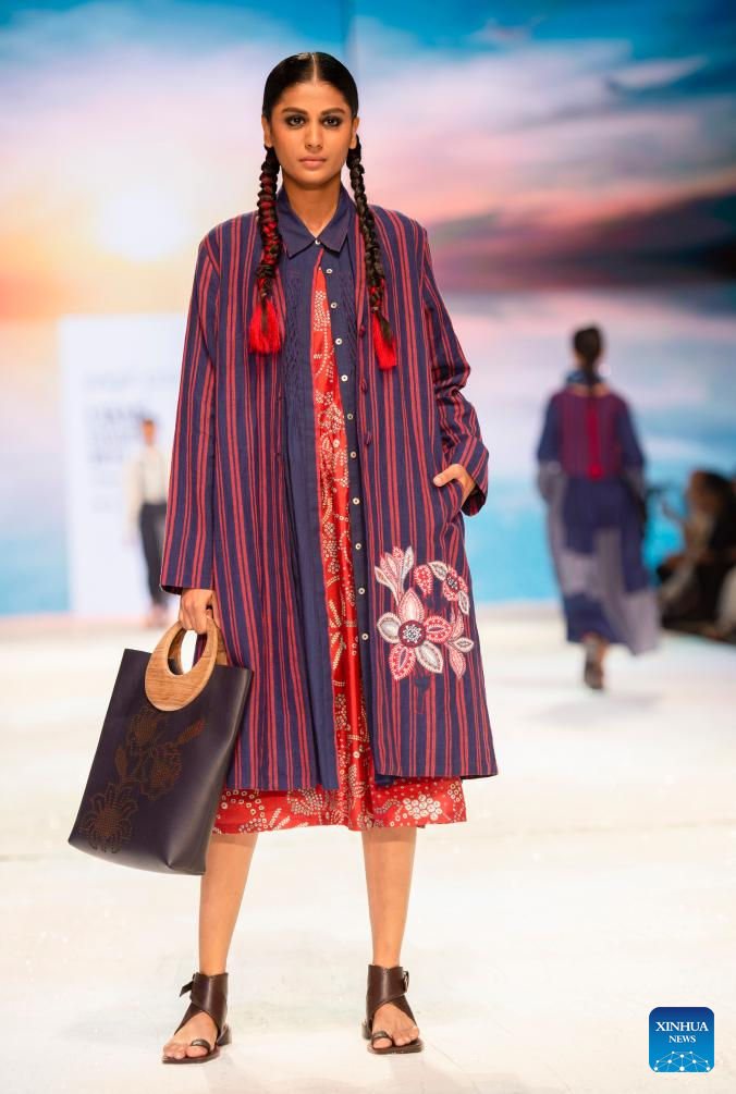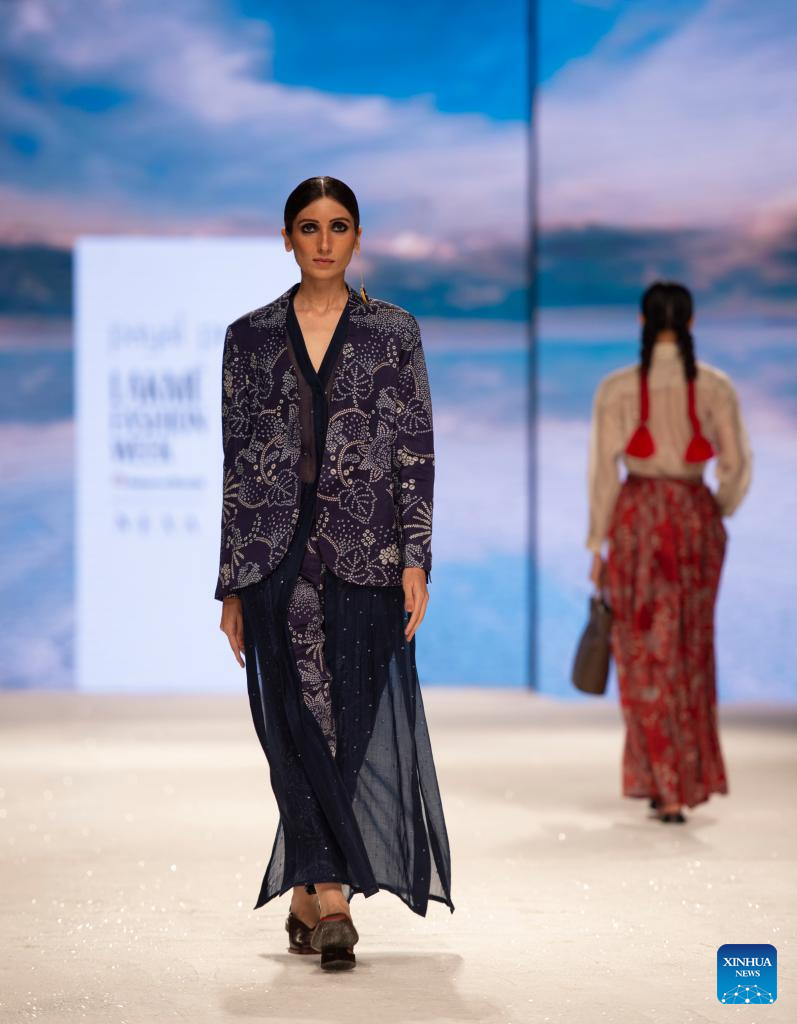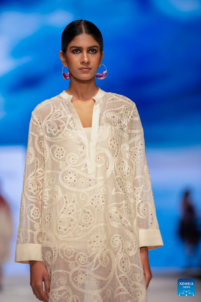A model presents a creation by Indian designer Payal Pratab during Lakme Fashion Week x FDCI in New Delhi, India, on Oct. 12, 2023. (Xinhua/Javed Dar)