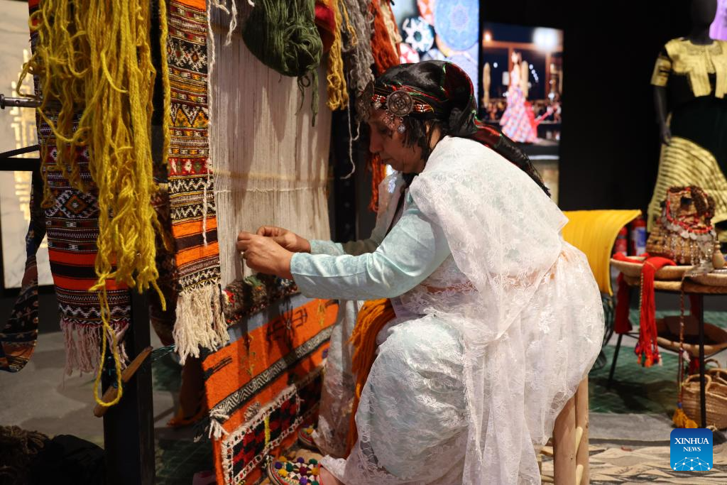 A woman demonstrates the making of Moroccan carpet at the campus of IMF and World Bank annual meetings, in Marrakech, Morocco, Oct. 13, 2023. Morocco on Friday displayed its culture by setting up an area for traditional music performances and handicraft exhibition at the campus of IMF and World Bank annual meetings. (Xinhua/Huo Jing)