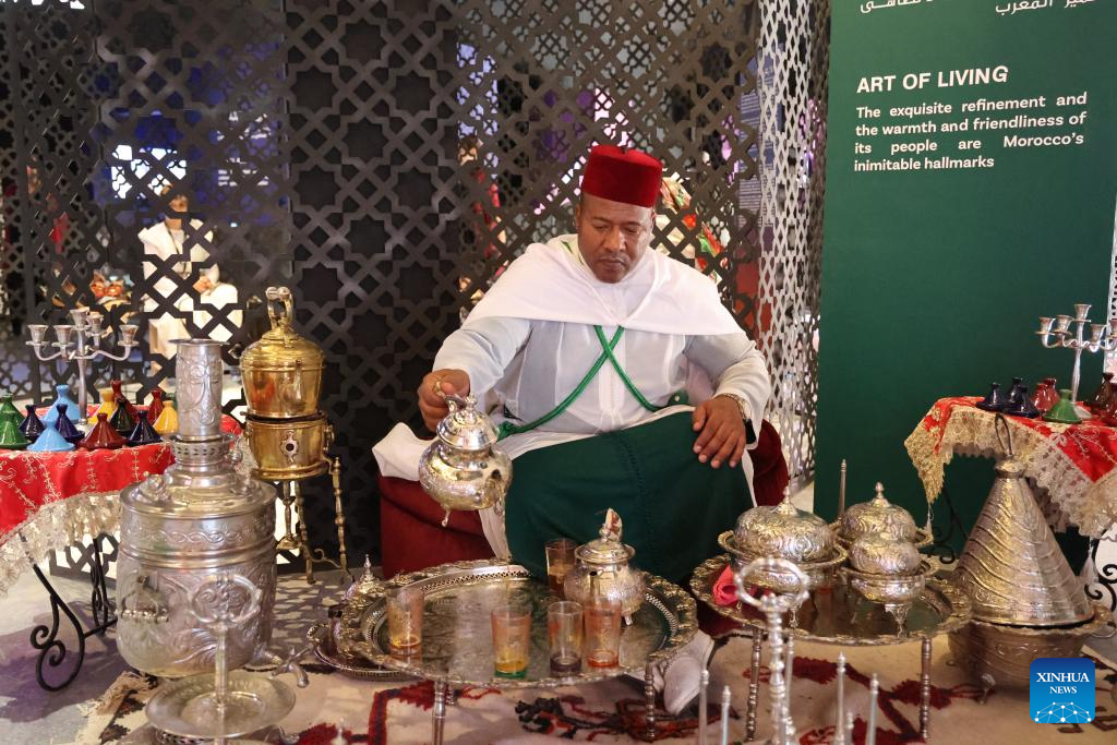 A man performs Moroccan tea ceremony at the campus of IMF and World Bank annual meetings, in Marrakech, Morocco, Oct. 13, 2023. Morocco on Friday displayed its culture by setting up an area for traditional music performances and handicraft exhibition at the campus of IMF and World Bank annual meetings. (Xinhua/Huo Jing)