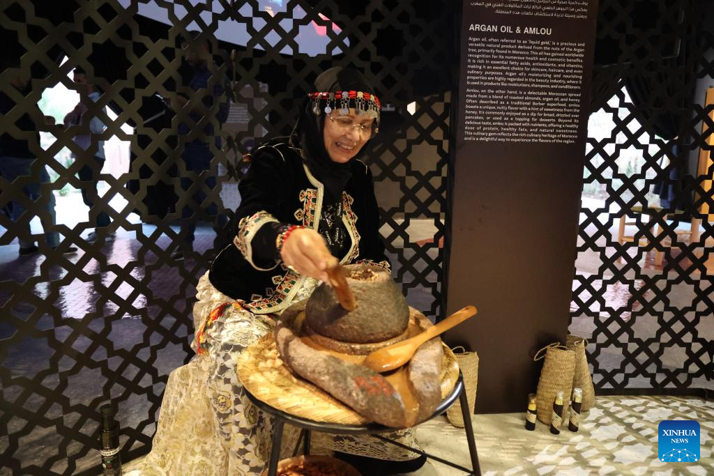 A woman demonstrates the making of Moroccan argan oil at the campus of IMF and World Bank annual meetings, in Marrakech, Morocco, Oct. 9, 2023. Morocco on Friday displayed its culture by setting up an area for traditional music performances and handicraft exhibition at the campus of IMF and World Bank annual meetings. (Xinhua/Huo Jing)