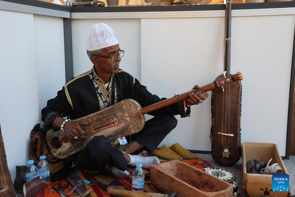 A man plays a traditional instrument of Morocco at the campus of IMF and World Bank annual meetings, in Marrakech, Morocco, Oct. 13, 2023. Morocco on Friday displayed its culture by setting up an area for traditional music performances and handicraft exhibition at the campus of IMF and World Bank annual meetings. (Xinhua/Huo Jing)