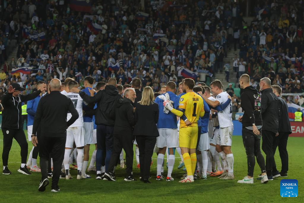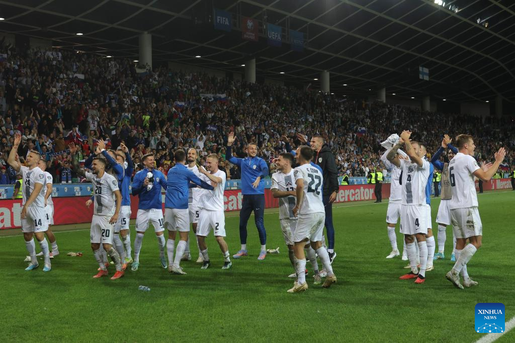 Team Slovenia celebrate the victory after the UEFA EURO 2024 Group H qualifying round football match between Slovenia and Finland in Ljubljana, Slovenia, on Oct. 14, 2023. (Photo by Zeljko Stevanic/Xinhua)