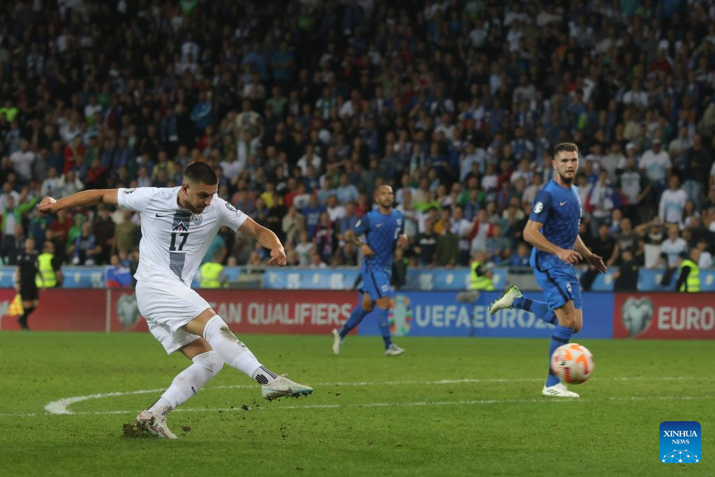 Andraz Sporar (C) of Slovenia breaks through during the UEFA EURO 2024 Group H qualifying round football match between Slovenia and Finland in Ljubljana, Slovenia, on Oct. 14, 2023. (Photo by Zeljko Stevanic/Xinhua)