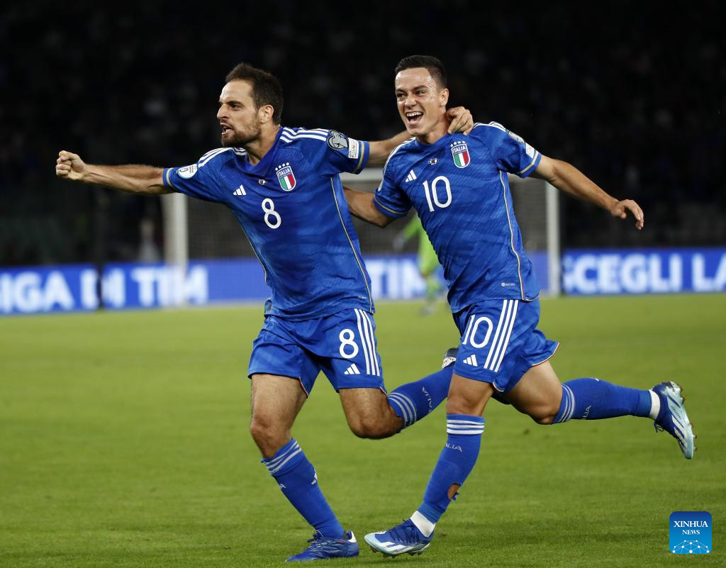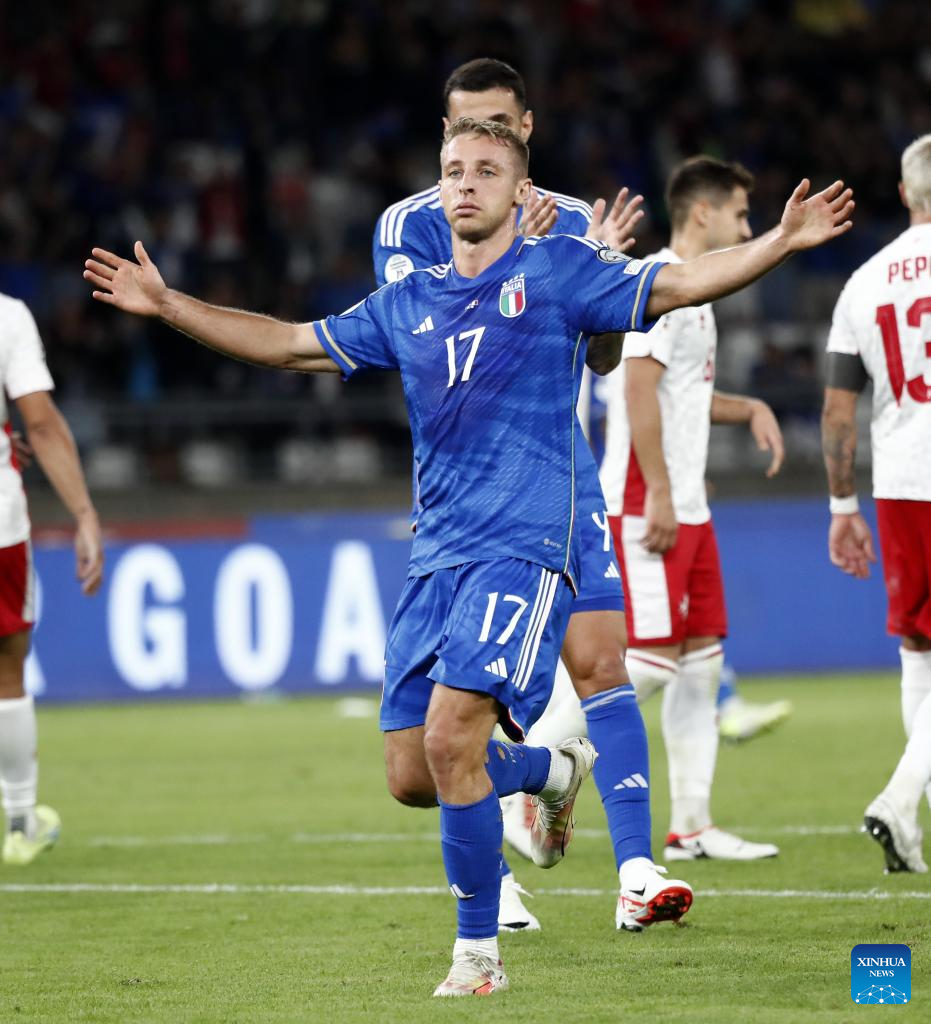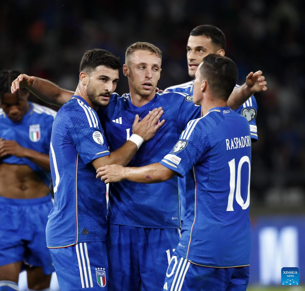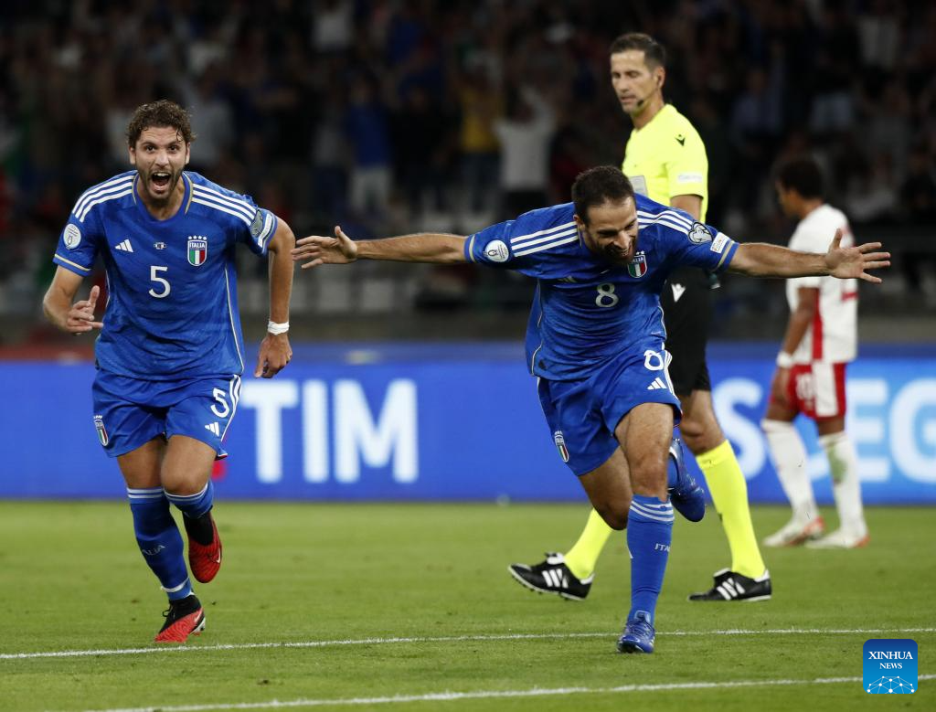 Italy's Davide Frattesi celebrates his goal during the UEFA EURO 2024 Group C qualifying round match between Italy and Malta in Bari, Italy, Oct. 14, 2023. (Photo by Augusto Casasoli/Xinhua)